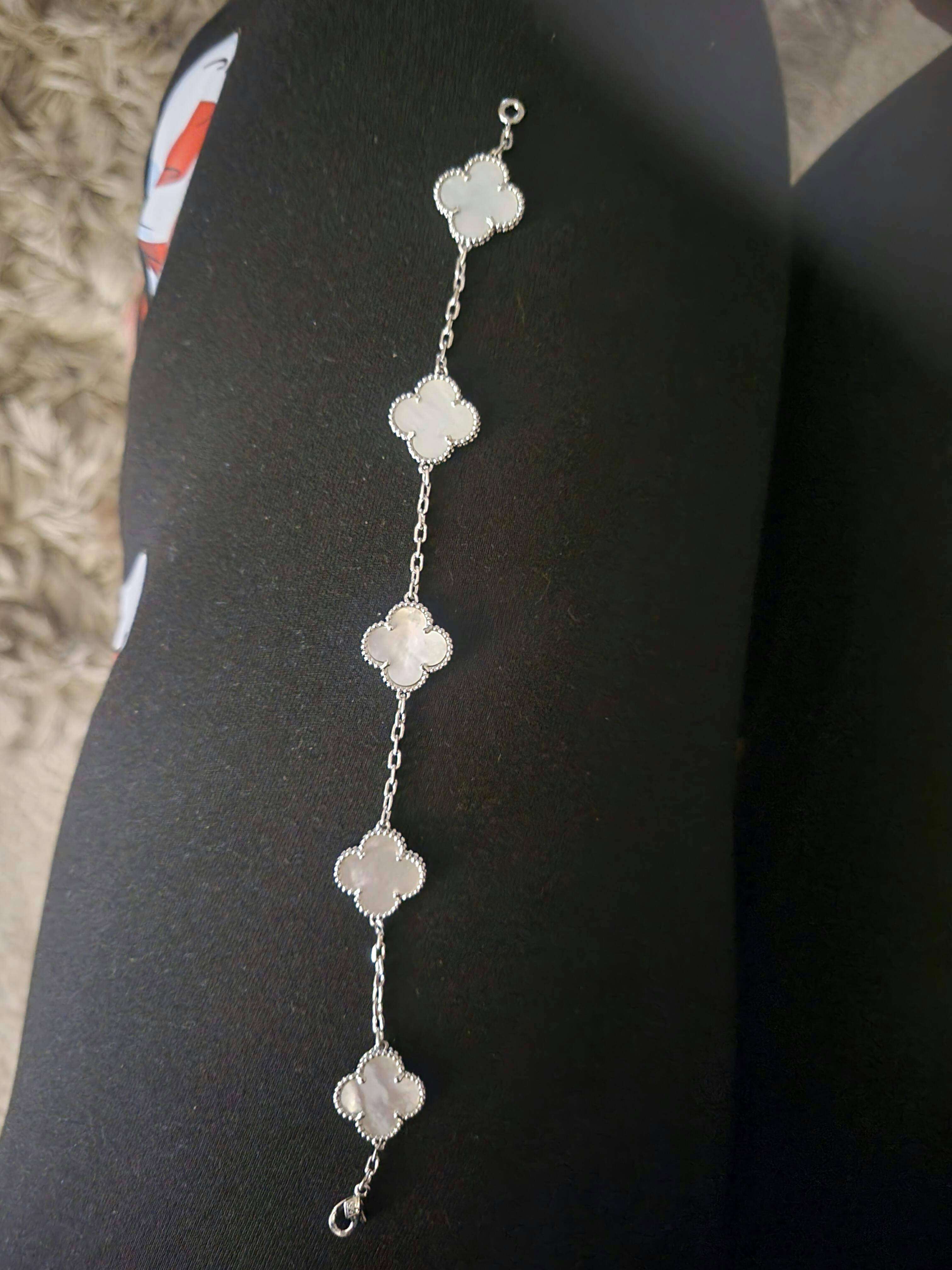 Discover the ethereal beauty of our Silver Mother of Pearl Clover Bracelet, a piece that perfectly captures the essence of "quiet luxury" and Van Cleef inspiration. This delicate bracelet features five iconic four-leaf clover motifs, each inlaid with hand-carved, iridescent Mother of Pearl. Set in high-quality silver with a luminous rhodium finish, the natural shimmer of the shell provides a soft, celestial glow that complements any skin tone.